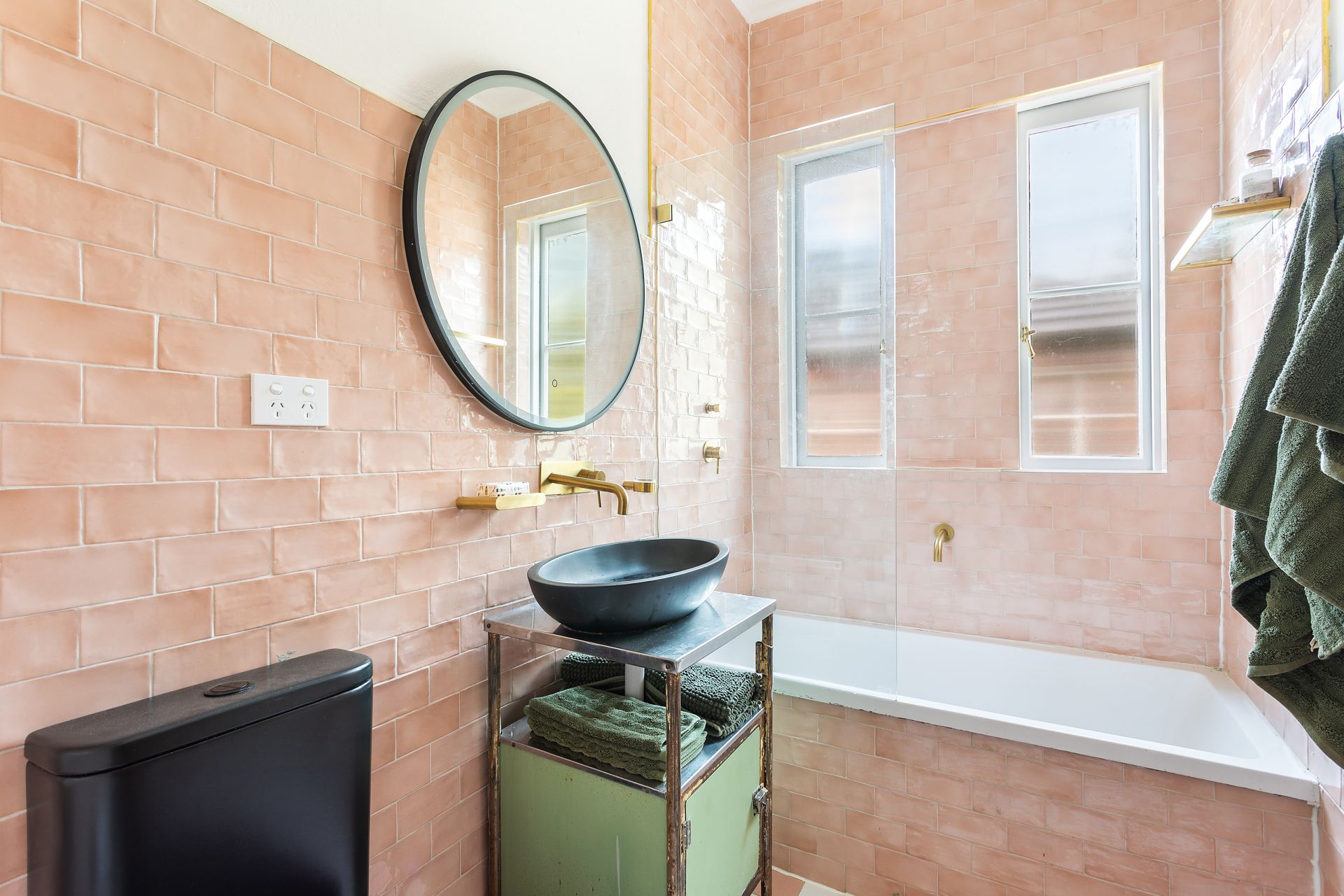 + Bathroom, bath, brass fittings, black toilet, rain shower