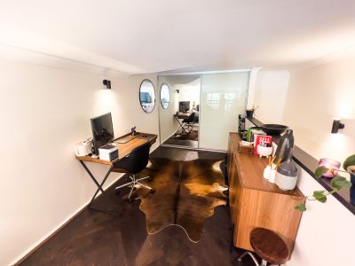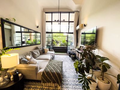 This Manhattan style apartment's open floorplan includes a large bedroom with study , as well as double height ceiling over the living area, with plenty of natural light.